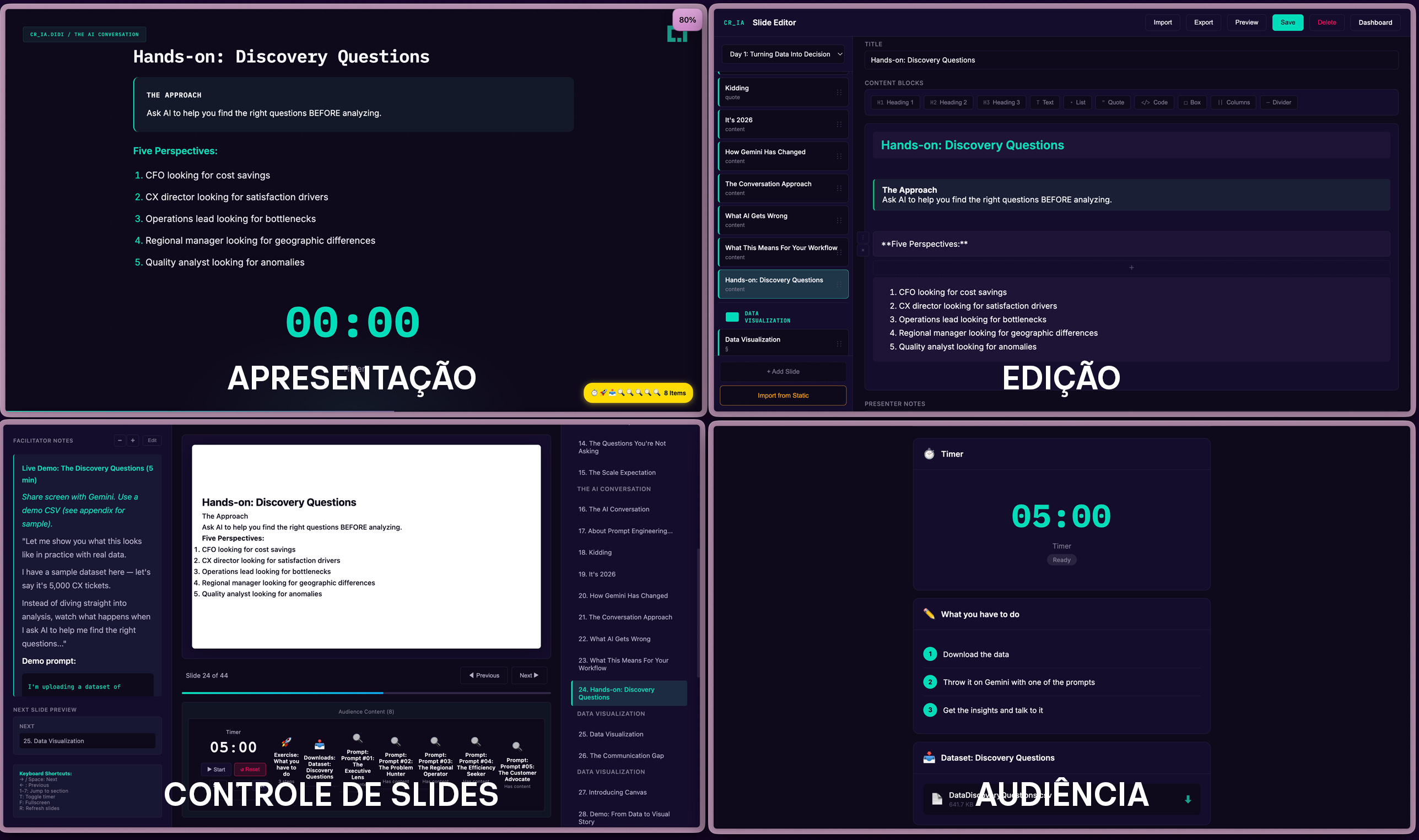 Então, literalmente da noite pro dia porque eu fiquei até as 5:30 da manhã fazendo isso, eu basicamente criei um novo produto, um novo software de criação de apresentações. Ele tem editor de slides, modo apresentação, modo apresentador pra eu ver minhas notas e controlar os slides e, o mais importante: uma tela que acompanha a apresentação do computador dos alunos já dando todos os links que eles precisam pra arquivos, dicas, prompts e até pra responder pesquisas na hora.